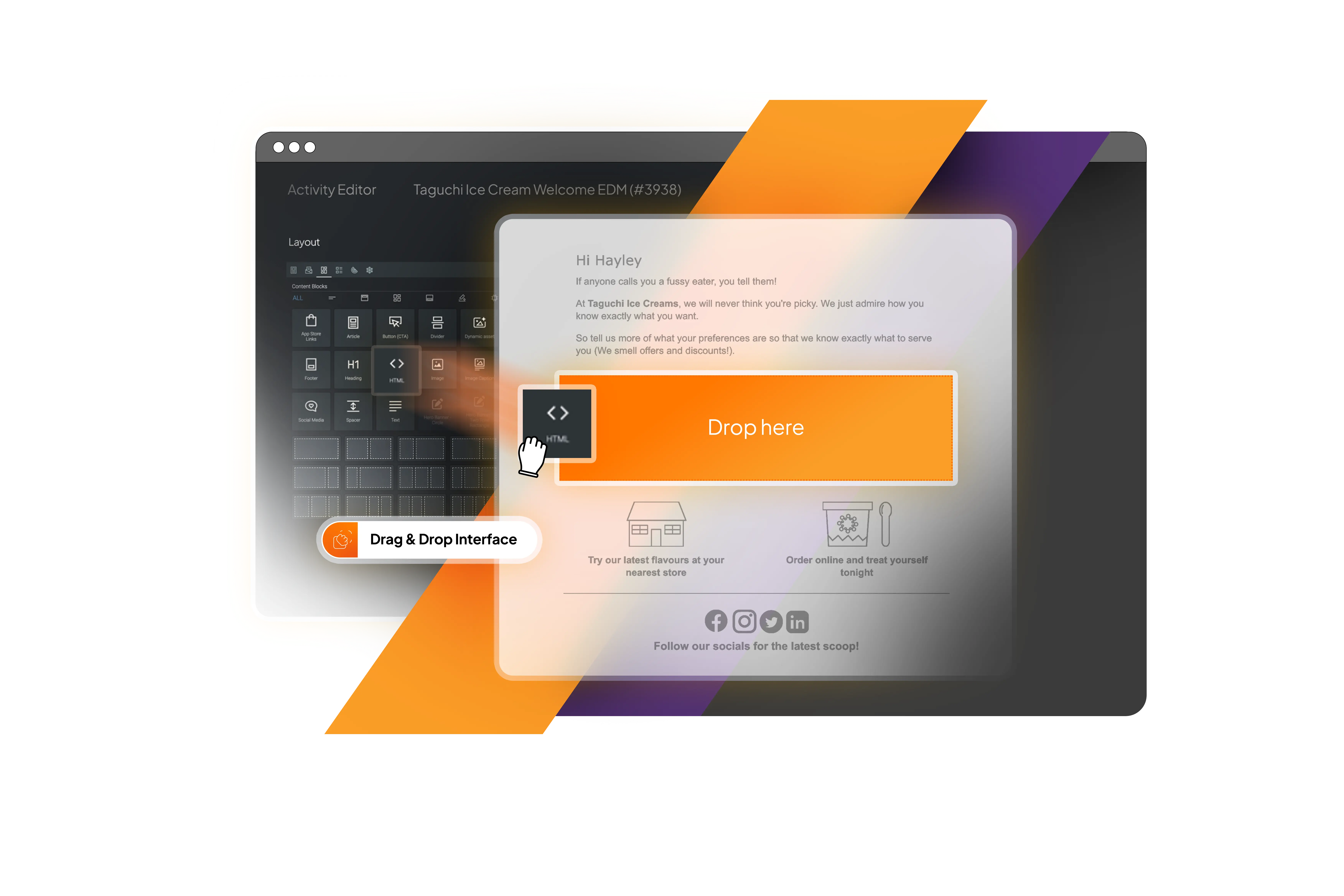 Design creative and professional looking emails with our intuitive drag-and-drop editor. No coding skills required.